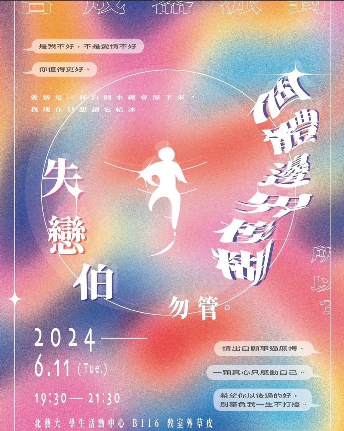 《個體邊界模糊 III-失戀伯 勿管》為延續以往合成器課程之學期展演活動,本次的《失戀伯 勿管》 主題是為探討身⽽為⼈的個體,在進入與離開親密關係後,邊界該如何模糊又再度分割。由同學實際經驗創作為題材,並以當代幾乎無⼈不在使⽤的社群媒體作為媒介,試圖剖析那些⾃⼰又或是戀⼈曾經說過的話,其中的真實或是虛無、永久或是短暫。