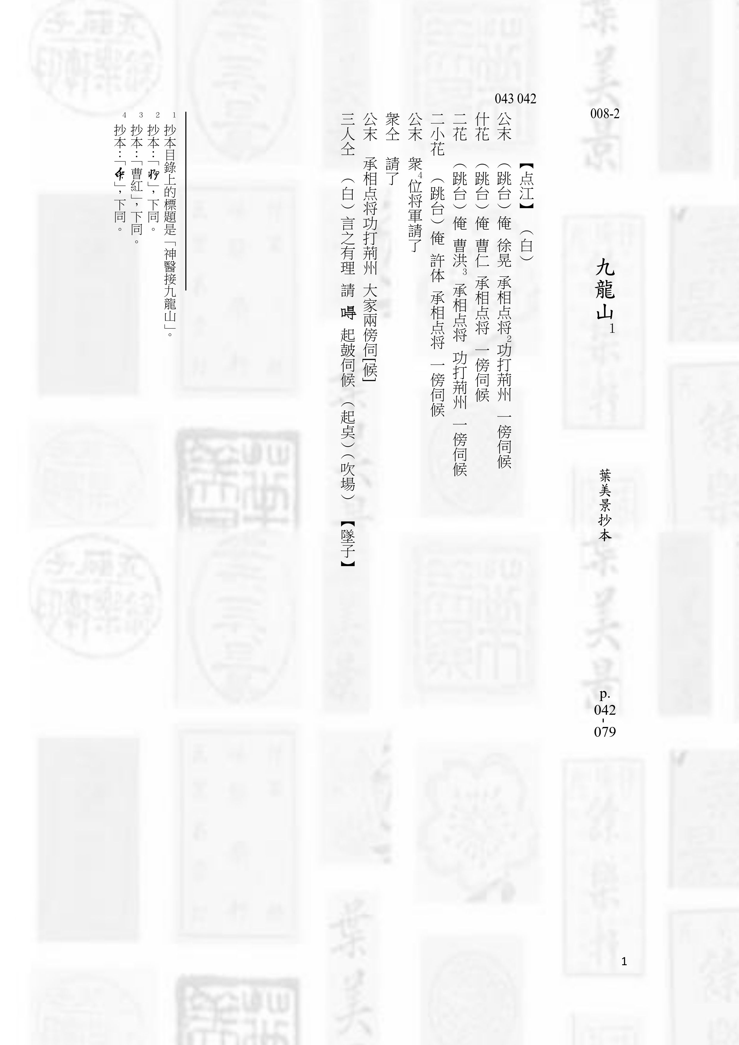 第8冊共包括6齣北管戲曲,此為第2齣〈九龍山〉。左圖為第一年計畫所進行的抄本原件掃描,右圖為今年進行的電腦打字排版整理稿件書影(部分)。