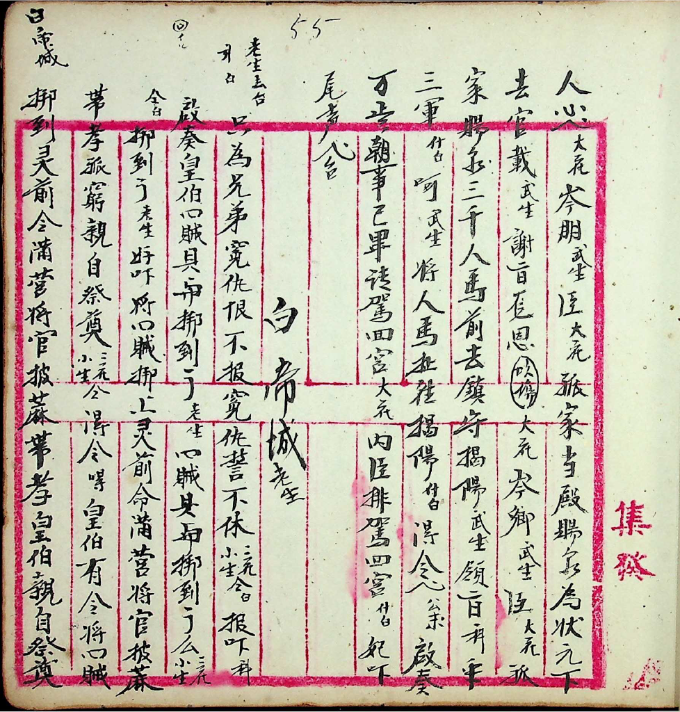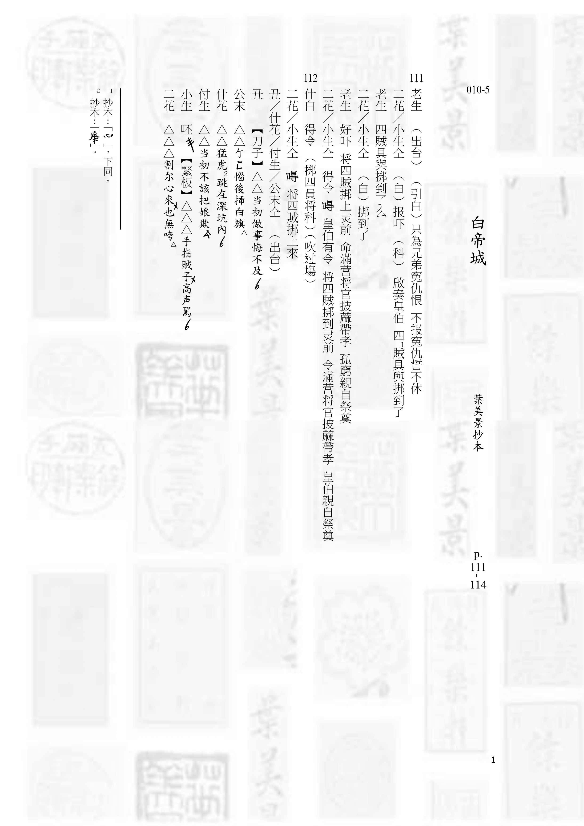 第10冊包括14齣北管戲曲,此為第5齣〈白帝城〉。左圖為第一年計畫所進行的抄本原件掃描,右圖為今年進行的電腦打字排版整理稿件書影(部分)。