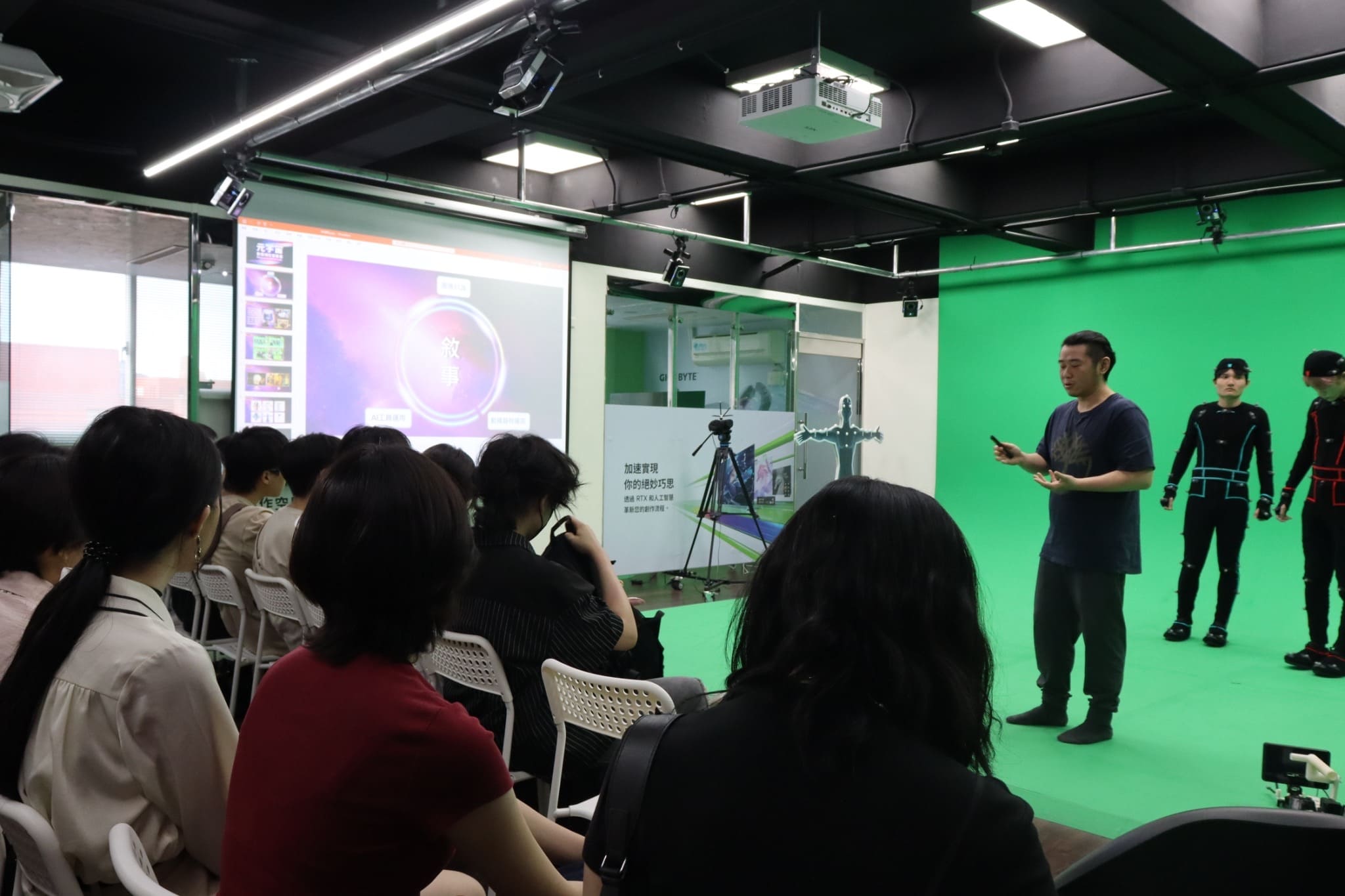 圖1. 動補實驗室講者孔垂暉先生正向北藝大同學說明元宇宙動捕實驗室的宗旨